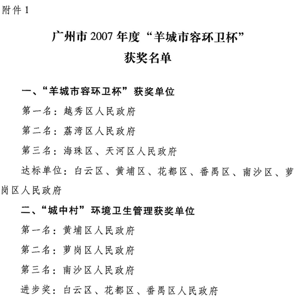 附件:1.广州市2007年度“羊城市容环卫杯”获奖名单