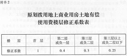 (二)原划拨土地上房屋补交土地有偿使用费作楼层修正(附件2)。当某层商业用房的土地有偿使用费楼层修正后低于所在地段综合(办公)用途的土地有偿使用费标准时,取其所在地段综合(办公)用途的土地有偿使用费标准。原划拨土地上综合(办公)、住宅、工业用房补交土地有偿使用费不作楼层修正。