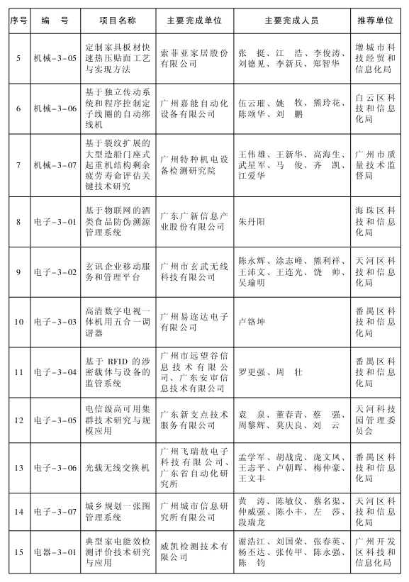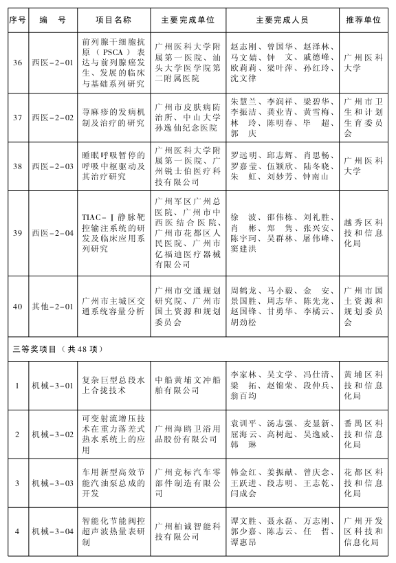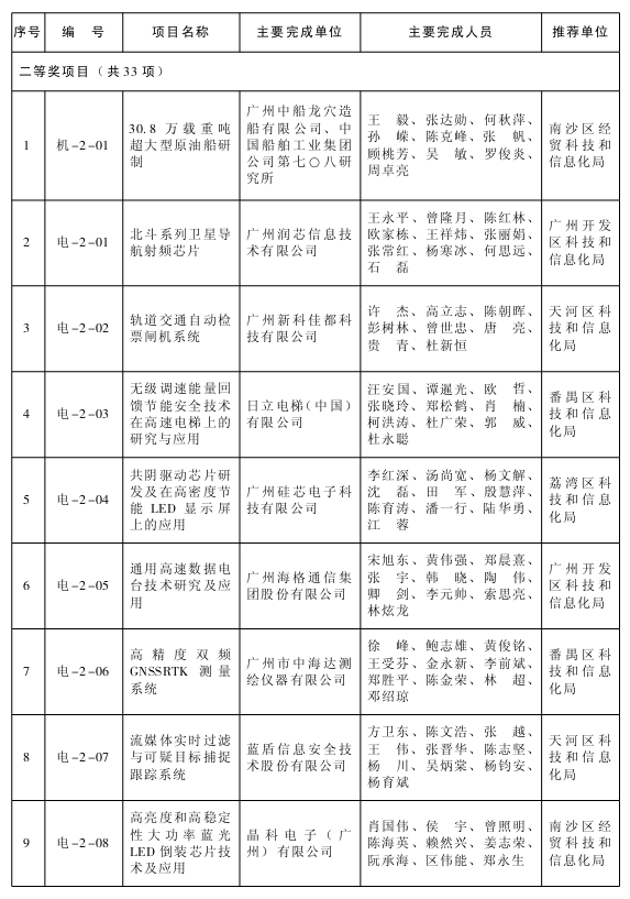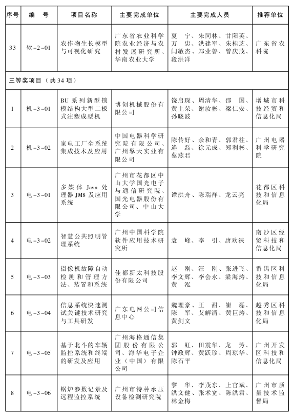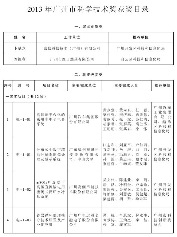 根据《广州市科学技术奖励办法》(市政府令〔2001〕第4号),经广州市科学技术奖评审委员会评定,市政府同意授予卜斌龙、刘艳春2013年广州市科学技术奖(突出贡献类);授予高智能平台化的乘用车电子电器系统等12项成果2013年广州市科学技术奖(科技进步类)一等奖;授予308万载重吨超大型原油船研制等33项成果2013年广州市科学技术奖(科技进步类)二等奖;授予BU系列新型锁模结构大型二板式注塑成型机等34项成果2013年广州市科学技术奖(科技进步类)三等奖。