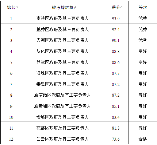 2014年,全市各级政府、各有关部门坚持以党的十八届三中全会和四中全会精神为统领,认真贯彻执行市委、市政府关于环境保护的决策部署,注重以环境保护优化发展,全面实施各项污染防治举措,努力推动环境质量和城乡环境面貌逐步改善,较好地完成了年度环保目标任务,为促进我市经济健康持续发展和群众安居乐业作出了积极贡献。根据《广东省环境保护责任考核办法》和《广州市2014年度环境保护目标责任考核工作方案》,市政府对各区政府及其主要负责人2014年环境保护目标任务完成情况进行了全面考核,现将考核结果通报如下: