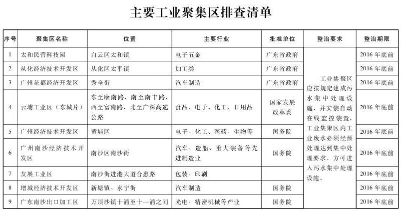 4.强化工业集聚区水污染治理。2016年6月底前,对辖区内经济技术开发区、高新技术开发区、出口加工区等工业集聚区的环保基础设施进行排查,严格检查各企业废水预处理、工业集聚区内污水与垃圾集中处理、在线监测系统等设施是否达到要求,对不符合要求的工业集聚区要列出清单提出限期整改计划。新建、升级工业集聚区应同步规划、建设污水、垃圾集中处理等污染治理设施。2016年底前,所有工业集聚区应按规定建成污水集中处理设施,并安装自动在线监控装置;逾期未完成设施建设或污水处理设施出水不达标的,一律暂停审批和核准其增加水污染物排放的建设项目,并由批准园区设立的部门依照有关规定撤销其园区资格。(市环保局牵头,市发展改革委、工业和信息化委、科技创新委、国土规划委、住房城乡建设委、商务委等参与,各相关区政府落实)