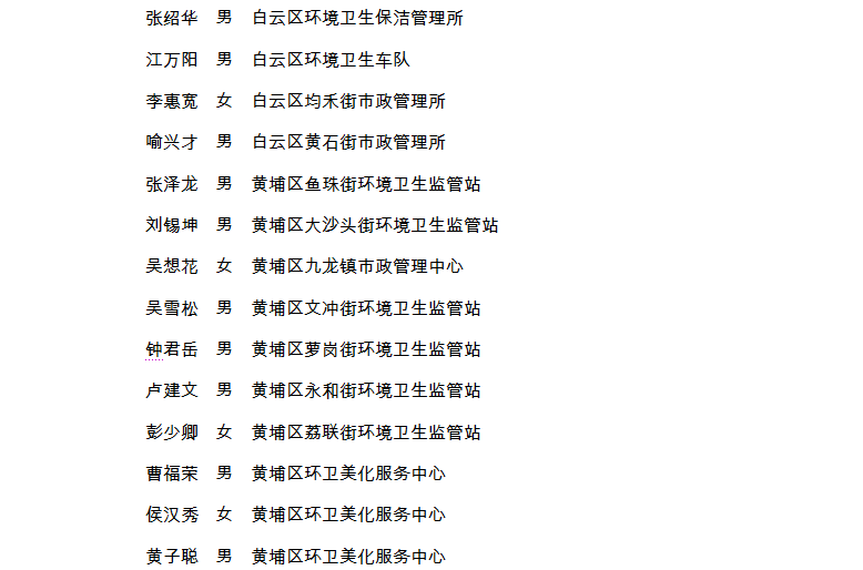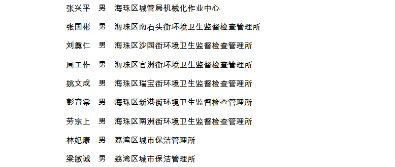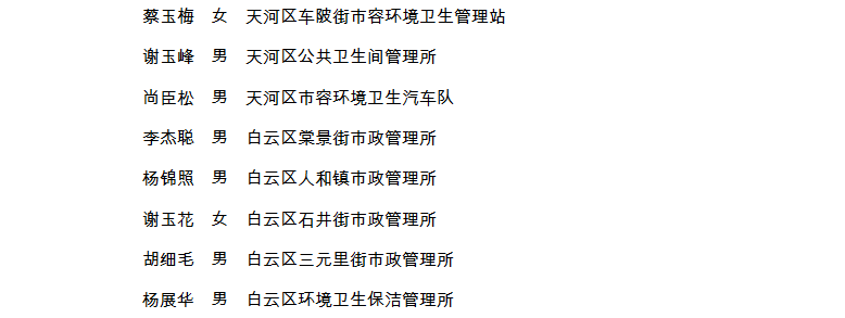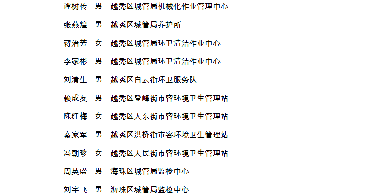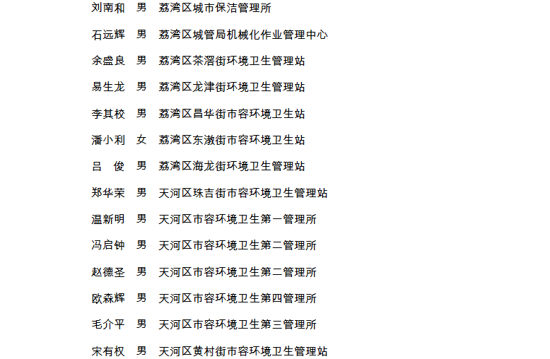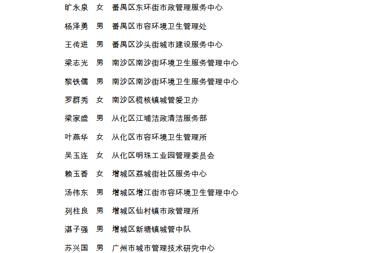 各区人民政府,市政府各部门、各直属机构:为打造干净、整洁的城市环境,2018年,全市城管系统一线环卫工人发扬“宁愿一人脏,换来万人洁”的精神,在城市环卫工作中扎实履行“城市美容师”职责,创造了优美、舒适的市容环境,切实提高了市民的获得感和幸福感。为鼓励先进,市政府决定对谭树传等100名荣获“优秀城市美容师”称号的先进个人给予通报表扬。