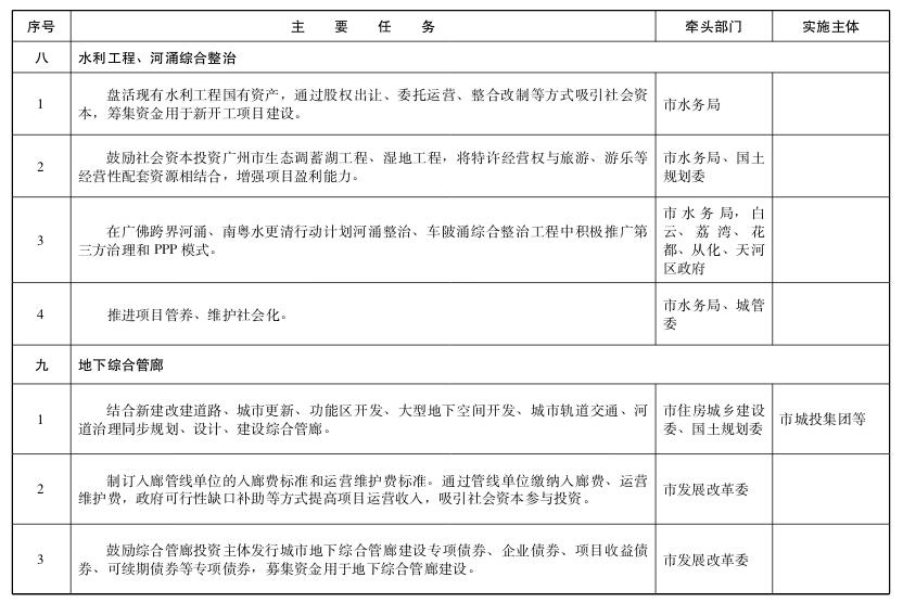 ——鼓励社会资本投资广州市生态调蓄湖工程、湿地工程,将特许经营权与旅游、游乐等经营性配套资源相结合,增强项目盈利能力。