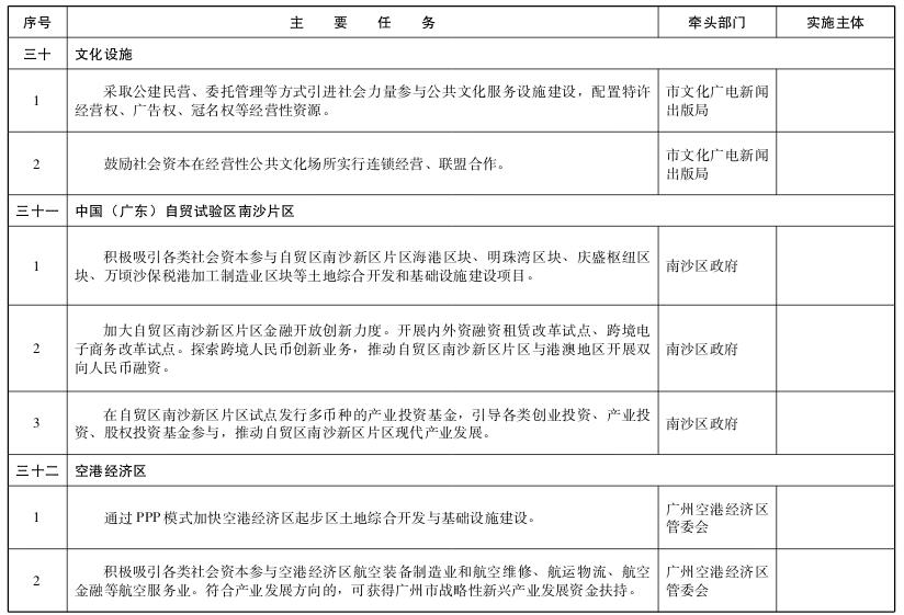 ——开展PPP模式先行先试,积极吸引各类社会资本参与自贸区南沙新区片区海港区块、明珠湾区块、庆盛枢纽区块、万顷沙保税港加工制造业区块等土地综合开发和基础设施建设项目。