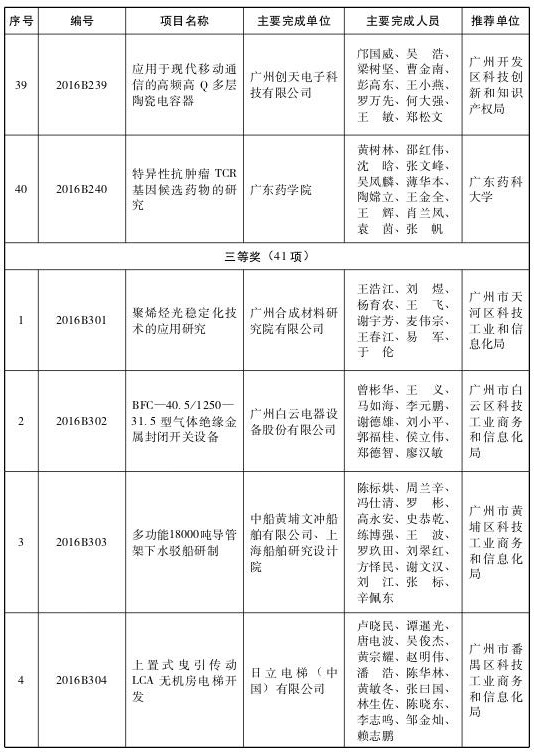 各区人民政府,市政府各部门、各直属机构:根据《广州市科学技术奖励办法》,经广州市科学技术奖评审委员会评定,市政府同意授予何晓顺教授、蒋宗勇研究员2016年广州市科学技术市长奖;授予“聚对苯二甲酰癸二胺(PA10T)合成及应用关键技术开发”等14项科技成果2016年广州市科学技术进步奖一等奖;授予“华南特色茄子抗青枯病种质资源创新及新品种选育与应用”等40项科技成果2016年广州市科学技术进步奖二等奖;授予“聚烯烃光稳定化技术的应用研究”等41项科技成果2016年广州市科学技术进步奖三等奖。