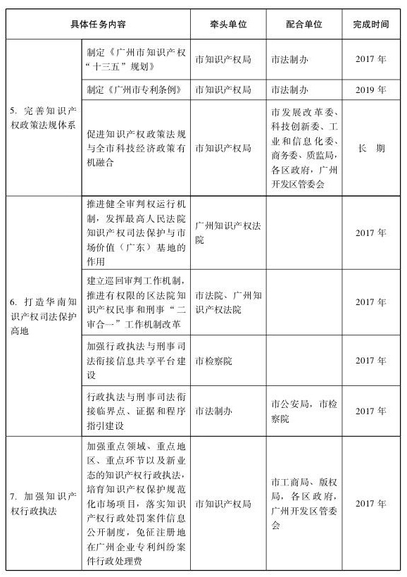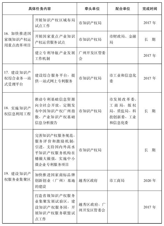 (五)完善知识产权政策法规体系。制定《广州市知识产权“十三五”规划》、《广州市专利条例》(牵头单位:市知识产权局,配合单位:市法制办)。促进知识产权政策法规与全市科技经济政策有机融合(牵头单位:市知识产权局,配合单位:市发展改革委、科技创新委、工业和信息化委、商务委、质监局,各区政府,广州开发区管委会)。