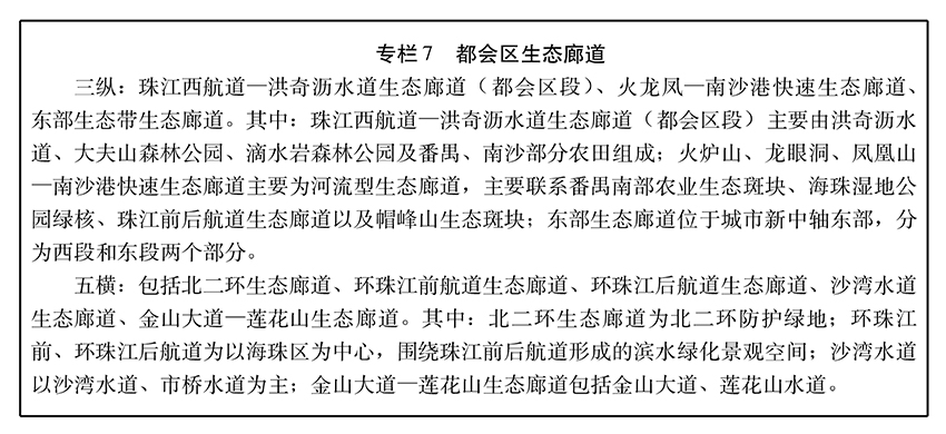 加强市域南北重要公益价值生态斑块的联系和都会区组团隔离,形成网络化的生态廊道体系,加强整体生态系统的多样性和功能性。都会区作为广州南北生态过程连续的关键区域,加快沿天河智慧城、广州国际金融城、海珠生态城、广州大学城等都市区生态廊道建设,形成“三纵五横”生态廊道系统。