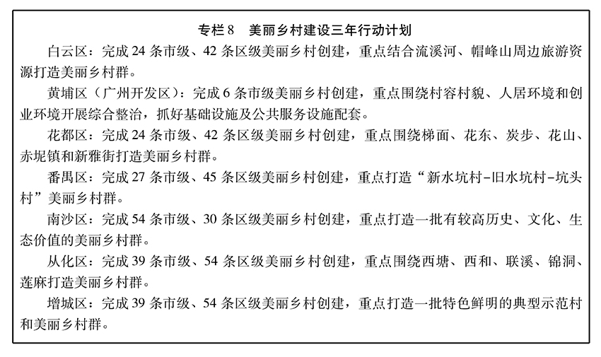 加强村庄公共空间规划,合理安排基本农田、村落分布、生态涵养等乡村空间布局。着力保护基本农田、生态环境和文化资源,发展中心村、保护特色村、整治空心村,科学引导农村居民点建设。坚持分类指导,因地制宜,黄埔区、南沙区全面开展综合整治,白云区、花都区、番禺区重点推进城乡区域一体协调发展,增城区、从化区着力发展都市农业型、生态田园型、乡村旅游型美丽乡村。