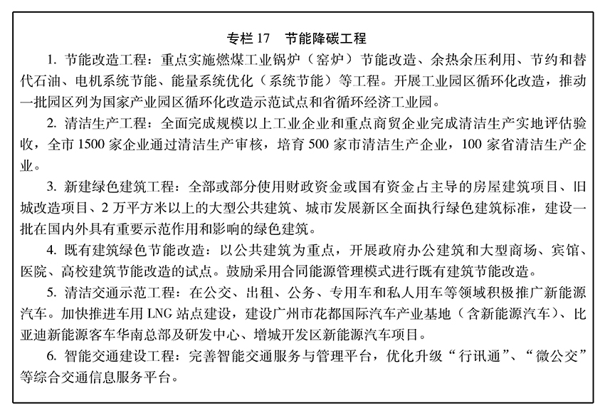深化碳排放权交易,制定碳排放权交易总量设定与配额分配方案,在石化、水泥、电力等行业先行启动碳排放权配额交易,逐步扩大到建筑、交通等行业。在碳现货交易的基础上,推广探索碳期货、碳金融。完善碳交易注册登记系统,建立碳排放权交易市场监管体系。创造条件建设碳交易现货全国平台,争取设立以碳为首个交易品种的广州创新型期货交易所。