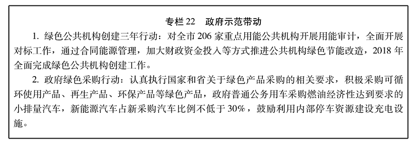 推进公共机构建筑节能改造和审计工作,2018年,公共机构大型建筑全面达到节能标准。积极推广应用节水技术,全面普及节水器具,2020年全部公共机构建成节水型单位。鼓励政府机关、事业单位采取合同能源管理及其他购买服务的方式,加强资源节约管理,提高能源、水等资源利用效率,降低使用成本。推进资源综合利用,加强废旧商品、建筑垃圾等分类收集,鼓励公共机构与有资质的企业建立定点定期回收机制,到2020年回收利用率达到80%以上。加强餐厨废弃物管理,鼓励公共机构安装餐厨废弃物就地资源化处理设备。完善政府强制采购和优先采购制度,提高采购节能环保产品的能效水平和环保标准,扩大政府采购节能环保产品范围,不断提高节能环保产品采购比例。推进政府机关采购可循环使用产品、再生产品、环保产品等绿色产品,加大对硒鼓、墨盒、再生纸等再生产品的政府采购支持力度。政府普通公务用车采购1.8升(含)以下、燃油经济性达到要求的小排量汽车和新能源汽车,择优选用纯电动汽车,鼓励利用内部停车资源建设充电设施。营造绿色办公环境,因地制宜实施小微绿化、屋顶绿化和垂直绿化。践行绿色办公方式,广泛推进无纸化办公,推广普及视频会议,探索推行弹性工作制和错峰上下班。