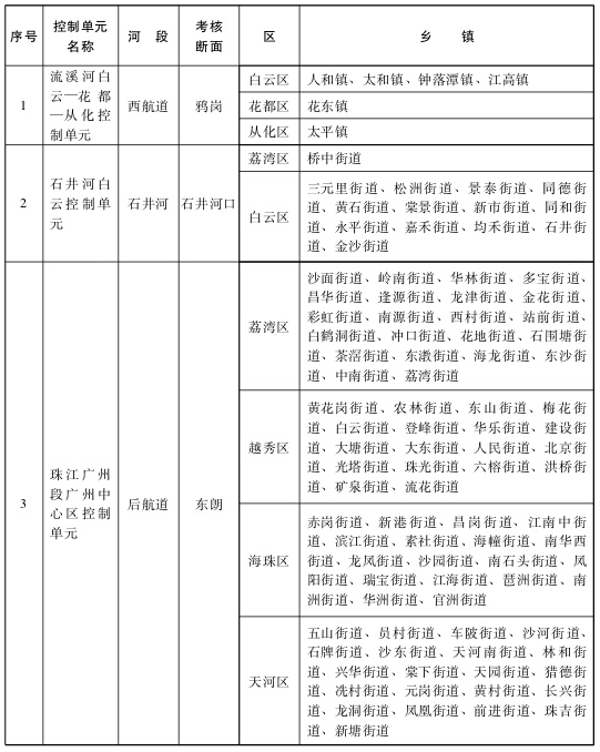 本方案的工作范围是水质未能稳定达到阶段性考核要求的鸦岗、石井河口、东朗、大坳4个断面及其对应的流溪河白云—花都—从化控制单元、珠江广州段广州中心区控制单元、石井河白云控制单元、白坭河花都控制单元,各控制单元包含的行政辖区见附件1。
