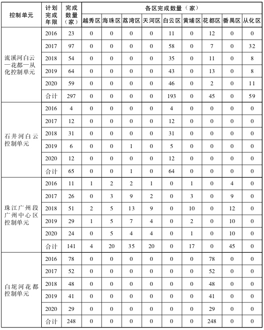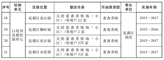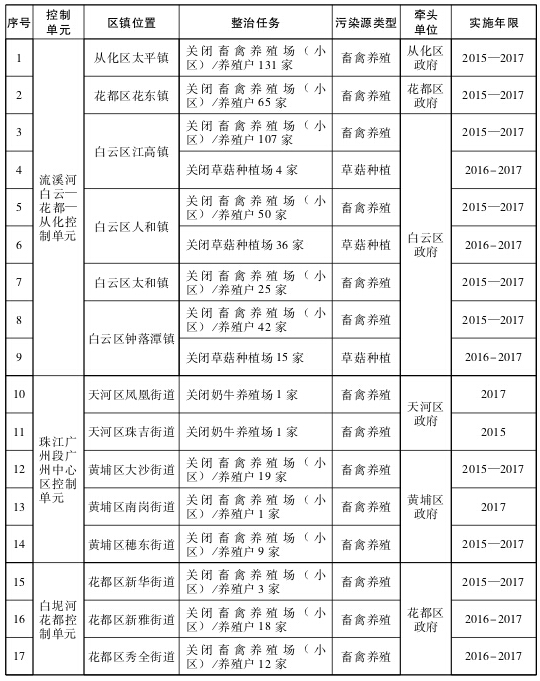 注:本表中所列“农业污染源整治任务”来源于广州市2014年、2015年环统数据中规模化养殖场企业名单、广州畜禽养殖禁养区养殖户名单以及各区的《广佛跨界河涌污染源专项整治百日行动》等资料,实施年限为2015年及2015—2016年的现均已整治完毕。