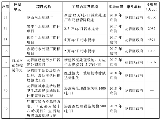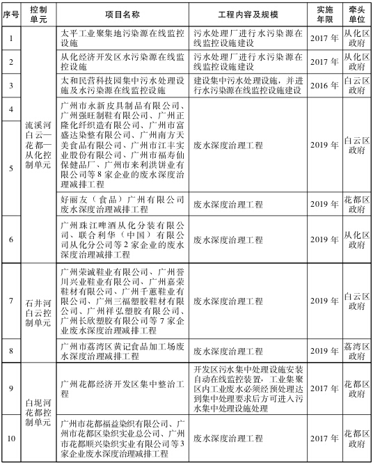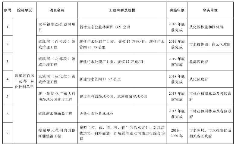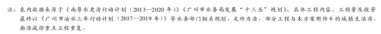 (2)资料来源:主要参考了《广州治水三年行动计划(2017—2019年)》、《广州市水务局关于加快城镇污水处理厂提标改造工作的通知》(穗水规划〔2016〕137号)、《广州市水务局关于印发流溪河等广佛跨界河涌治理工程建设方案的通知》(穗水规划〔2014〕105号)、《从化区水污染防治方案》、《广州市污水治理总体规划修编(2007—2020)》、《广州实施南粤水更清行动计划工作方案》、《广州市水更清建设方案》、《广州市供排水优化设置方案》。