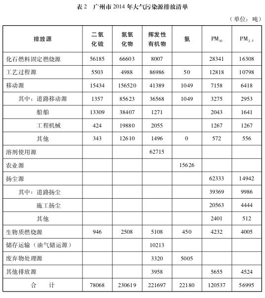 根据我市大气污染物源排放清单研究结果,2014年,我市排放二氧化硫为7.8万吨,氮氧化物为23.1万吨,一氧化碳为36.5万吨,挥发性有机物为22.2万吨,氨气为2.2万吨,PM10为12.1万吨,PM 2.5为5.7万吨。其中,化石燃料固定燃烧源是二氧化硫的主要来源,占比达72.0%;移动源在氮氧化物排放中占比最大,达67.9%,移动源氮氧化物排放量前三位依次为道路移动源、船舶和工程机械;工艺过程源、溶剂使用源和道路移动源是挥发性有机物的主要排放源,三者合计占比达到86%;一次排放的PM10和PM 2.5则主要来源于扬尘源和固定源,其中扬尘源在一次排放的PM10和PM 2.5中占比分别达到51.7%和26.2%;氨气主要来源于农业源。