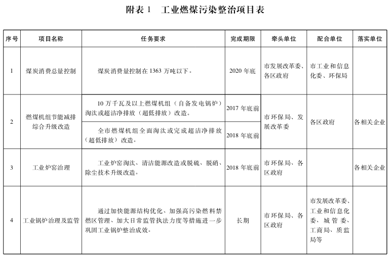 2017年底前,完成10万千瓦及以上燃煤机组(含自备发电锅炉)淘汰或超洁净排放(超低排放)改造;2018年6月底前,全市燃煤机组全面淘汰或完成超洁净排放(超低排放)改造。结合国家、省政策,适时推进新一阶段“上大压小”节煤减排升级改造。