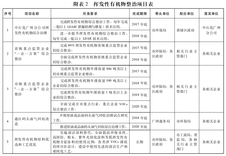 按照环境保护部等6部门印发的《关于印发〈“十三五”挥发性有机物污染防治工作方案〉的通知》(环大气〔2017〕121号)、《广州市环境保护局关于印发广州市挥发性有机物污染综合整治工作方案(2017-2020年)的通知》(穗环〔2017〕52号)等部署以及“一企一方案”的原则,结合各行业生产工艺及排放特点,通过采取源头预防、过程控制、末端治理等综合措施逐步推进各重点行业、重点企业挥发性有机物综合整治。督促企业使用低VOCs含量的原辅材料,探索建立重点行业有机溶剂使用申报制度;推广清洁生产技术,采取有效措施防止或减少无组织排放和泄漏;强化治理工程建设,逐步推进VOCs在线监测设施建设,提高企业VOCs综合整治水平。