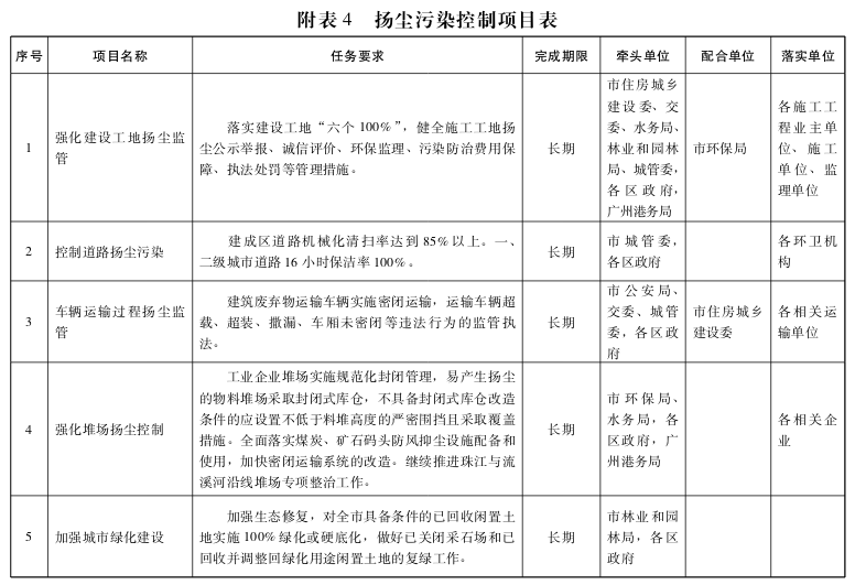 工业企业堆场实施规范化封闭管理,易产生扬尘的物料堆场采取封闭式库仓,不具备封闭式库仓改造条件的应设置不低于料堆高度的严密围挡且采取覆盖措施。堆场内进行搅拌、粉碎、筛分等作业时应喷水抑尘,在空气重污染期间禁止产生扬尘作业。物料装卸配备喷淋等防尘措施,转运物料尽量采取封闭式皮带输送。厂区主要运输通道实施硬化并定期冲洗或湿式清扫,堆场进出口设置车辆冲洗设施,运输车辆实施密闭或全覆盖,及时收集清理堆场外道路上撒落的物料。试点安装工业堆场网格化微型颗粒物在线监控设施,与城市扬尘在线监控平台联网,实现工业企业堆场扬尘动态管理。全面落实煤炭、矿石码头防风抑尘设施配备和使用,加快密闭运输系统的改造。继续推进珠江与流溪河沿线堆场专项整治工作。