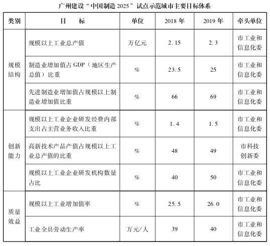 1.创建实施阶段(2017年1月—2018年7月)。积极贯彻《中国制造2025》以及《广州制造2025战略规划》基本要求,各部门按本方案的职责分工落实各项重点工作,在重点领域遴选一批龙头企业或行业领军企业开展试点,加快培育符合“中国制造2025”战略的制造业产业体系,促进产业结构转型升级。