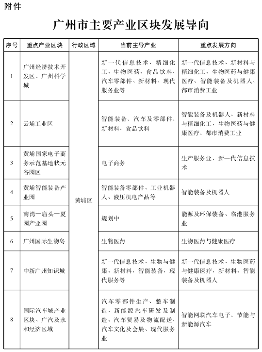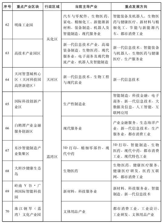 以广州国际生物岛为核心,中心城区、白云区、黄埔区、南沙区、从化区多点布局,打造生物医药与健康产业集群。广州国际生物岛以生物医药领域研究和产品开发为主导,重点打造国家级生物医药研发基地。白云区依托广州生物医药基地重点发展医药制造业,加快推进国家健康城建设,打造“研发设计—医药制造—健康服务”全链条大健康产业集群。黄埔区以云埔工业区、广州经济技术开发区、中新广州知识城为载体,重点发展生物制药、化学合成创新药、现代中药、高端医疗机械设备,加快突破基于基因信息和分子标志物的精准治疗技术。南沙区加快推进中创生物科技与医疗器械产业园项目,整合华南地区优质医疗器械和生物科技企业。荔湾区依托大坦沙健康生态岛、广州国际医药港、广州3D打印产业园重点推进医药应用转化,探索发展3D打印医疗器械产业,形成医、疗、休、养、游全产业链的高端健康生态产业区。从化区以明珠工业园和高技术产业园区为载体,加快发展生物医药产业,推动本地生物医药企业做大做强。