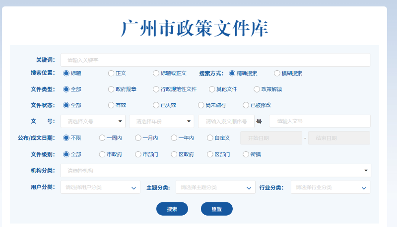 “更多检索”直达“广州市政策文件库”,公众可以在此通过筛选正文或标题关键词、文件效力状态、文号、公布或成文日期、文件制定单位级别等多种要素,对近300件市政府规章、6000余件全市行政规范性文件以及30000余件全市主动公开的其他文件及相关政策解读进行精准检索,快速定位所需文本,极大提升了文件查找的效率和准确性。