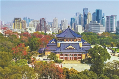 中山纪念堂及越秀山的木棉次第盛开,和苍翠的古树相映成趣