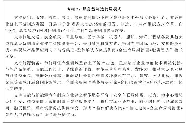 实施服务型制造与“互联网+服务”示范试点,鼓励企业通过兼并重组等方式向价值链两端拓展,促进“生产型制造”向“服务型制造”转变。面向汽车、装备制造、纺织服装、物流、能源、医疗器械等重点领域开展智能服务试点示范工作,积极引导制造企业以用户为中心构建智能服务平台,推动制造企业向个性化定制、整体解决方案、全生命周期管理等高端服务发展。