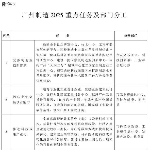 全国重要的高端装备制造业创新基地。强化企业技术创新主体地位,提高创新设计能力,以中国(广州)智能装备研究院、广州中国科学院工业技术研究院、相关大学等组织和科研机构以及龙头企业为载体,加快推进科技成果产业化,进一步完善制造业创新体系;实施高端装备创新工程和制造业创新中心建设工程,在节能与新能源汽车、轨道交通、船舶与海洋工程、智能成套设备等重点领域推动实施一批创新和产业化专项,申报一批国家级或重大工程项目,建设若干国家级制造业创新中心(工业技术研究基地),打造全国重要的高端装备制造业创新基地。