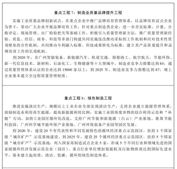 到2025年,制造业整体素质大幅提升,创新能力显著增强,两化融合迈上新台阶,质量效益名列国内前茅。拥有一批国际知名、国内领先的跨国公司和产业集群,在全球产业分工的地位显著提升,产业链向附加值高的部分充分延伸。重点行业单位工业增加值能耗、物耗及污染物排放达到世界先进水平。