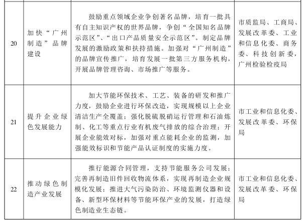 实施品牌发展战略,鼓励重点领域企业争创著名品牌,培育一批具有自主知识产权的世界品牌,争创“全国知名品牌示范区”、“出口产品质量安全示范区”,提升“广州制造”整体形象。制定品牌发展的激励政策和扶持措施。加强对“广州制造”的品牌宣传推广,培育发展一批第三方服务机构,开展品牌管理咨询、市场推广等服务。
