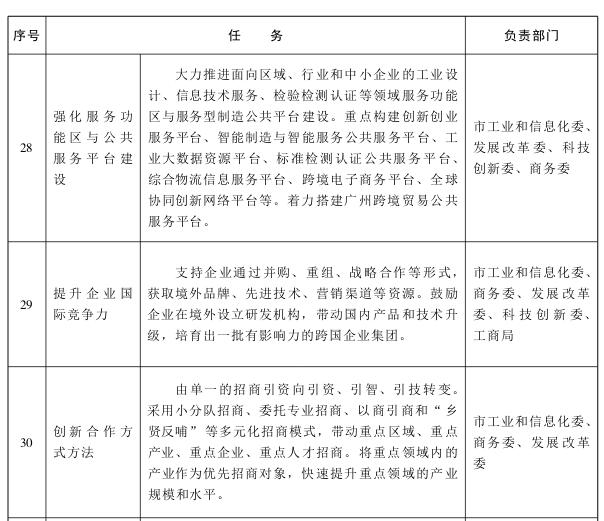 大力推进面向区域、行业和中小企业的工业设计、信息技术服务、检验检测认证等领域服务功能区与服务型制造公共平台建设。重点构建创新创业服务平台、智能制造与智能服务公共服务平台、工业大数据资源平台、标准检测认证公共服务平台、综合物流信息服务平台、跨境电子商务平台、全球协同创新网络平台等7大公共服务平台支撑体系。着力搭建广州跨境贸易公共服务平台,为国际贸易企业提供海外战略咨询、法律援助、人才培训等服务,降低企业“走出去”的战略风险。