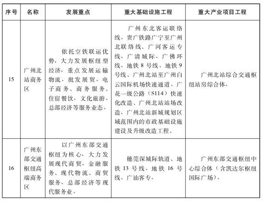 (一)强化广州国际综合交通枢纽功能。加快推进广州第二机场、白云国际机场扩建工程、白云国际机场第二高速公路工程、广州港深水航道拓宽工程、广州港南沙港区四期工程、南沙国际邮轮码头工程等一批重点工程规划建设。推动港区功能调整和海港泊位结构优化。强化与泛珠腹地城市合作,共建一批无水港,大力拓展内陆市场。积极争取航权航线开放,鼓励基地公司发展北美洲、欧洲、大洋洲、非洲等中远程国际航线。力争“十三五”期间白云国际机场新开通30条全货运航线,广州港新增30条国际班轮航线,进一步提升航空枢纽和航运枢纽的航线网络覆盖面和通达性。拓展广州铁路货运枢纽国际服务功能,加快建设中欧班列的广州始发基地,积极向国家争取设立铁路一类口岸。按照“客在内、货在外”的思路,结合产业集聚区规划,整合中心城区既有铁路货运站,推动铁路货运站场及物流园区向外围城区布局,完成中心城区内大中型货运场站外迁。推进广州集装箱中心站、南沙万顷沙物流中心、增城铁路货站建设,大力构建辐射华东、华中与西南、珠三角地区集装箱中转、联运、区域性物流配送的全国性铁路货运枢纽,与南沙海港实现联动发展。策划一批关键通道、关键节点和重点工程,加强与周边国家和地区的跨境物流体系和走廊建设。