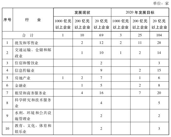 到2020年,服务经济发展规模稳步提升,产业结构和区域布局更加优化,现代物流、金融、商贸会展、信息、科技、文化创意等高端服务业占比大幅提高;具有全球影响力的国际航运枢纽、国际航空枢纽、国际科技创新枢纽建设取得重大进展,国际航运中心、国际物流中心、国际贸易中心、现代金融服务体系和国家创新中心城市功能框架与标志初步形成;国家中心城市资源配置能力和集聚辐射能力显著增强。