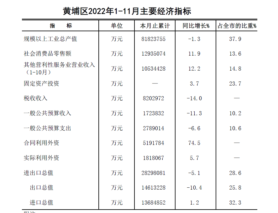 2022年11月黄埔区主要经济指标