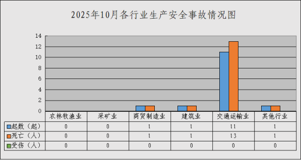 据统计,10月,全市发生生产安全事故14起、死亡16人,同比事故起数下降17.6%、死亡人数上升6.7%,其中,发生1起生产安全道路运输较大事故,死亡3人。
