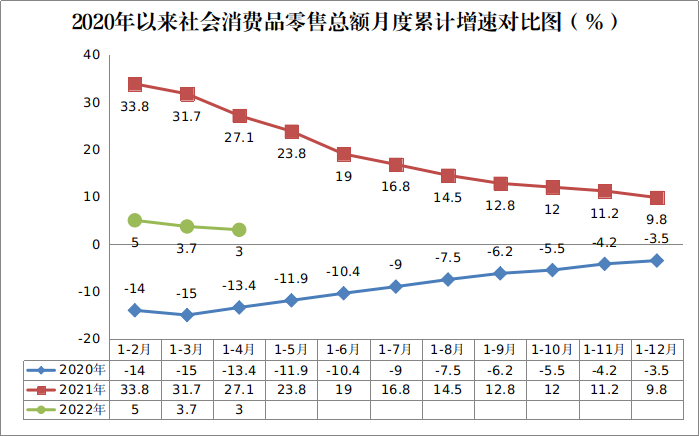 备注:2022年1-3月,全市社会消费品零售总额2709.34亿元,增长3%,增速低于全国(3.3%),高于全省(1.7%)、深圳(-1.6%)、北京(0.7%)、上海(-3.8%),比1-2月回落2个百分点。其中,3月当月,社零总额下降1%,消费市场恢复趋缓。