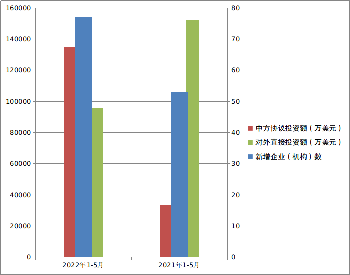 2022年1-5月对外经济合作业务统计报表时间新增企业(机构)数中方协议投资额(万美元)对外直接投资额(万美元)2022年1-5月77 135178 95858 2021年1-5月53 33384 152242