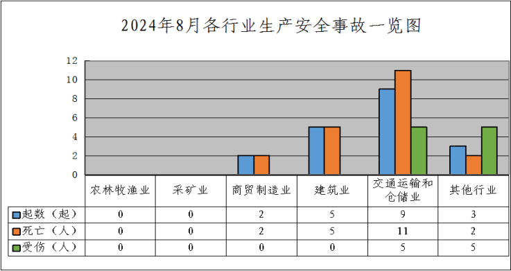 据统计,8月份,全市发生各类生产安全事故19起、死亡20人、受伤10人,同比事故起数下降13.6%、死亡人数持平、受伤人数下降33.3%。其中,发生1起较大事故,造成3人死亡、2人受伤。