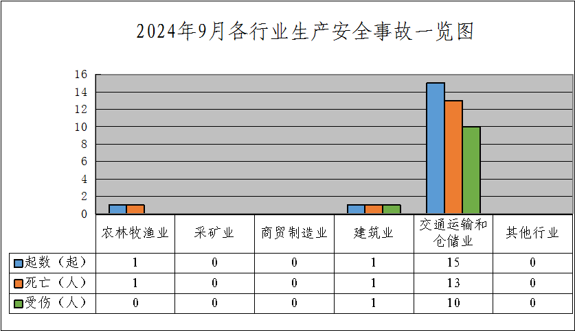 据统计,9月份,全市发生各类生产安全事故17起、死亡15人、受伤11人,同比事故起数下降19%、死亡人数下降28.6%、受伤人数上升83.3%;未发生较大及以上事故。