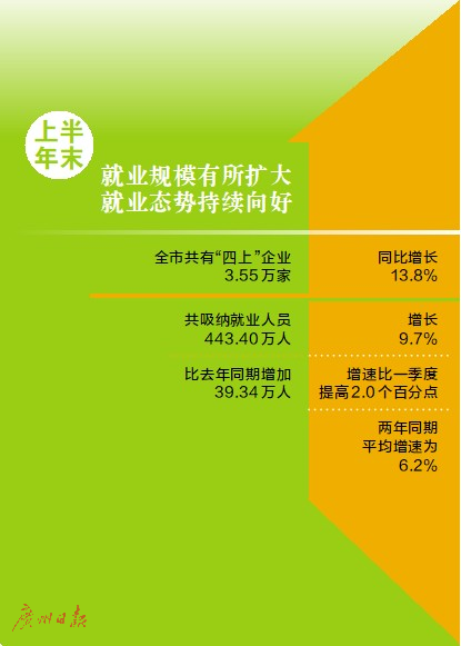 随着营商环境优化,广州市场主体增加,带动全市就业形势稳定向好。今年上半年末,广州共有“四上”企业3.55万家,同比增长13.8%,共吸纳就业人员443.40万人,比上年同期增加39.34万人,增长9.7%。其中,八成以上行业就业人员增加,就业岗位呈现向中高端发展趋势,天河区、黄埔区、越秀区吸纳就业人员总量和增量分列全市前三。