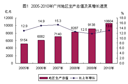 全市经济保持较快发展。2010年,广州市实现地区生产总值(GDP)10604.48亿元,按可比价格计算,比上年(下同)增长13.0%。其中,第一产业增加值189.05亿元,增长3.2%;第二产业增加值3950.64亿元,增长13.0%;第三产业增加值6464.79亿元,增长13.2%。第一、二、三次产业增加值的比例为1.8∶37.2∶61.0。三次产业对经济增长的贡献率分别为0.4%、38.4%和61.2%。