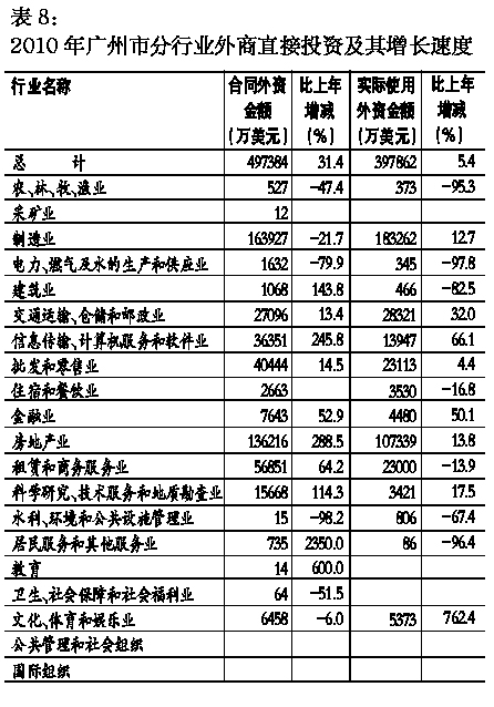 实际利用外资实现增长。全年实际使用外商直接投资金额39.79亿美元,增长5.4%;批准外商直接投资项目(企业)980个,增长16.1%;合同外商直接投资金额49.74亿美元,增长31.4%。全年批准投资总额在1000万美元以上的外商投资项目163个,合同外资金额41.27亿美元,增长9.8%。2010年,广州市吸收来自58个国家和地区的外商直接投资项目980个。截至2010年底,世界500强大企业累计已有174家进入广州,共设立411个项目,投资总额178亿美元。