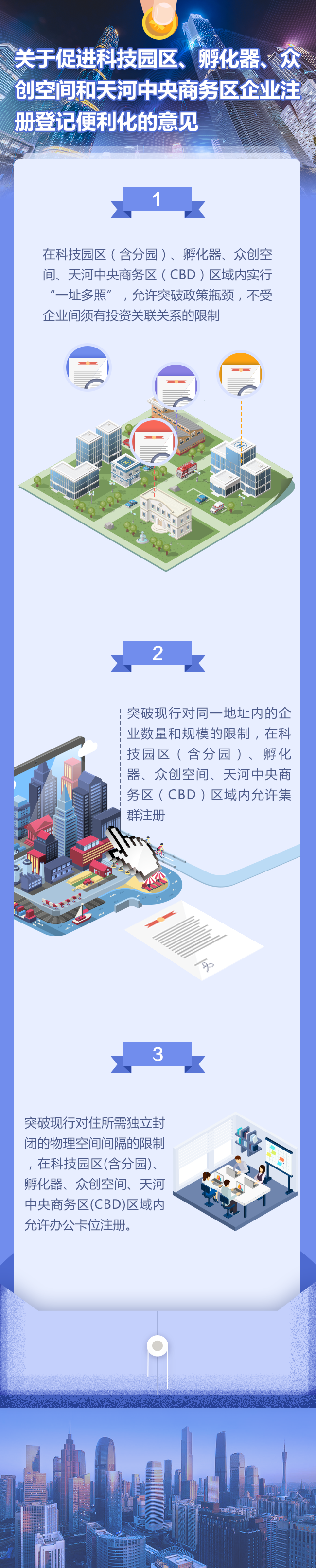 政策主要围绕着以下四个方面:一是扩大涵盖区域,将天河中央商务区纳入注册登记便利化的范畴,至此,注册登记便利化覆盖了科技园区、孵化器、众创空间以及天河中央商务区4个区域。二是释放场地资源,通过增加“政府有关部门出具的场地使用证明作为相关场地证明资料报工商部门预审”等内容,解决了部分历史性建筑未办理产权证而无法实施“一址多照、集群注册、卡位注册”政策的问题。三是减少审批环节,不再要求科技工业和信息化部门出具场地使用证明,直接由园区运营机构出具即可。四是放宽经营期限,不再按照是否取得房屋所有权证和《军队房地产租赁许可证》的期限来划分企业法人营业执照的经营期限。