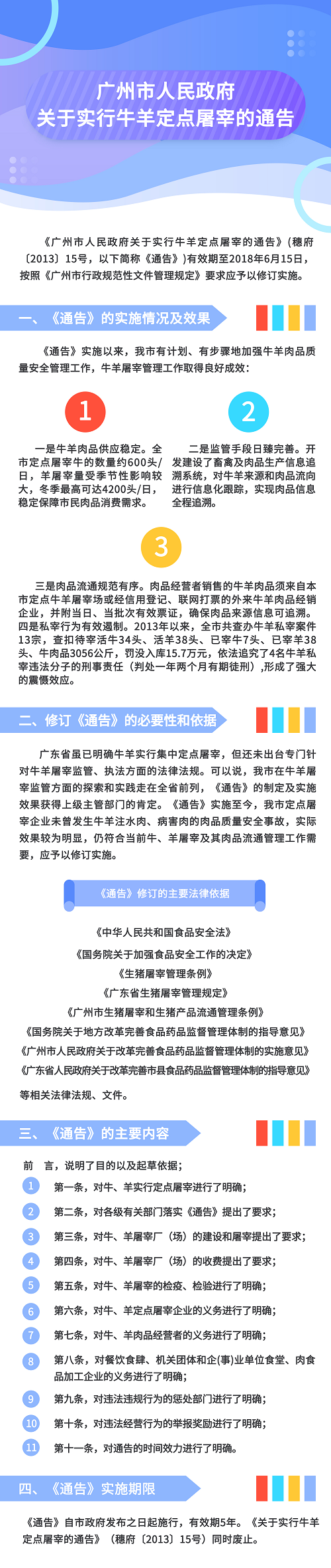 《大阳城集团娱乐视频关于实行牛羊定点屠宰的通告》(穗府〔2013〕15号,以下简称《通告》)有效期至2018年6月15日,按照《广州市行政规范性文件管理规定》要求应予以修订实施。
