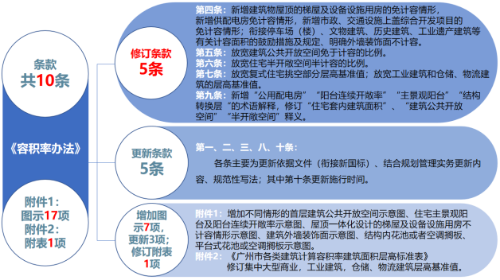 原办法为条款式,正文共10条,附件图示10个、附表1个。《容积率办法》主要修订条款内容5条,衔接依据文件、规范性写法更新条款内容5条,修订后共计条款10条,附件图示17个、附表1个。