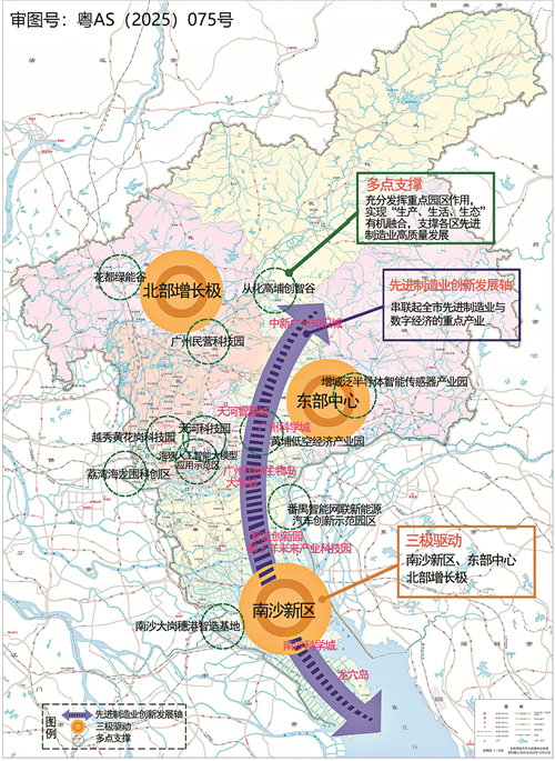 “三极”,即以南沙新区、东部中心、北部增长极为先进制造业基地重要承载区,集聚创新型企业、创新型技术、创新型人才,增强产业链韧性,辐射带动各区制造业向高端化、智能化、绿色化发展。