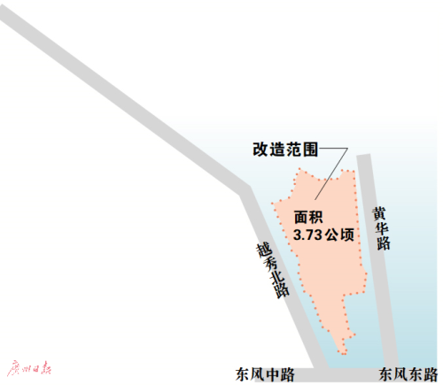 项目位于越秀区中心区,东风东路与黄华路交界处,西至东濠涌高架,北至金濠大厦,东至黄华路,南临东风东路,改造范围面积3.73公顷,改造地块主要包括南洋电器厂、黄华塘社区、红胜街公安宿舍。