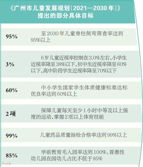 7月12日,广州市政府网站发布了《广州市儿童发展规划(2021—2030年)》(以下简称《规划》),《规划》提出的目标是进一步推动儿童在健康、安全、教育、福利、环境、法律保护领域的权利进一步实现,让广州儿童整体发展水平走在全国前列。