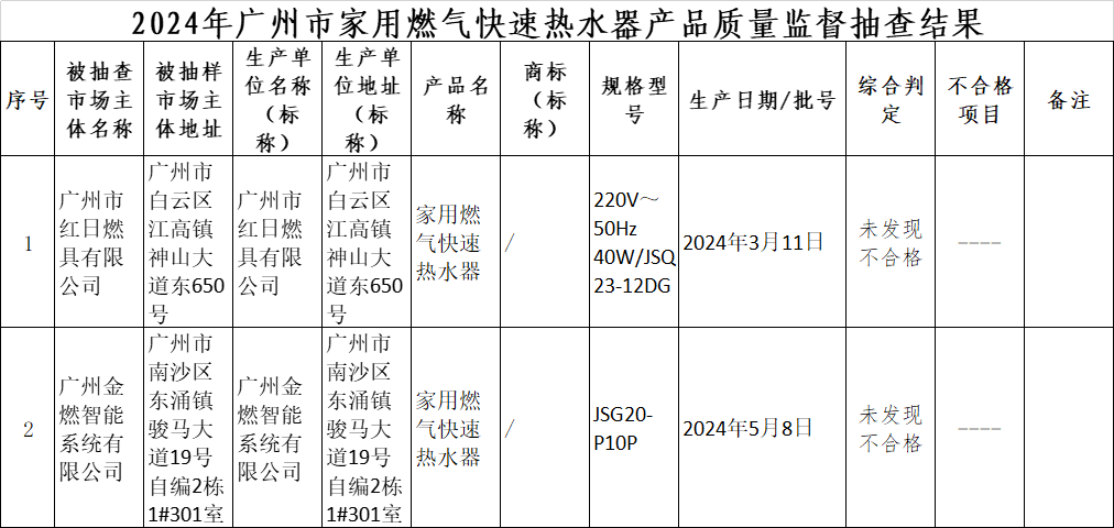2024年第三季度,广州市市场监督管理局对家用燃气快速热水器产品质量进行了监督抽查,共抽查了2批次样品,经检验,全部产品符合标准要求。