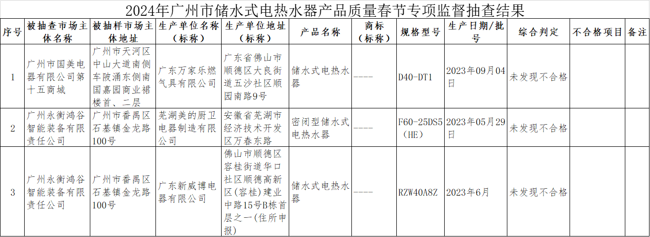 近日,广州市市场监督管理局对储水式电热水器产品质量进行了专项监督抽查,共抽查了3批次样品,经检验,未发现不合格。