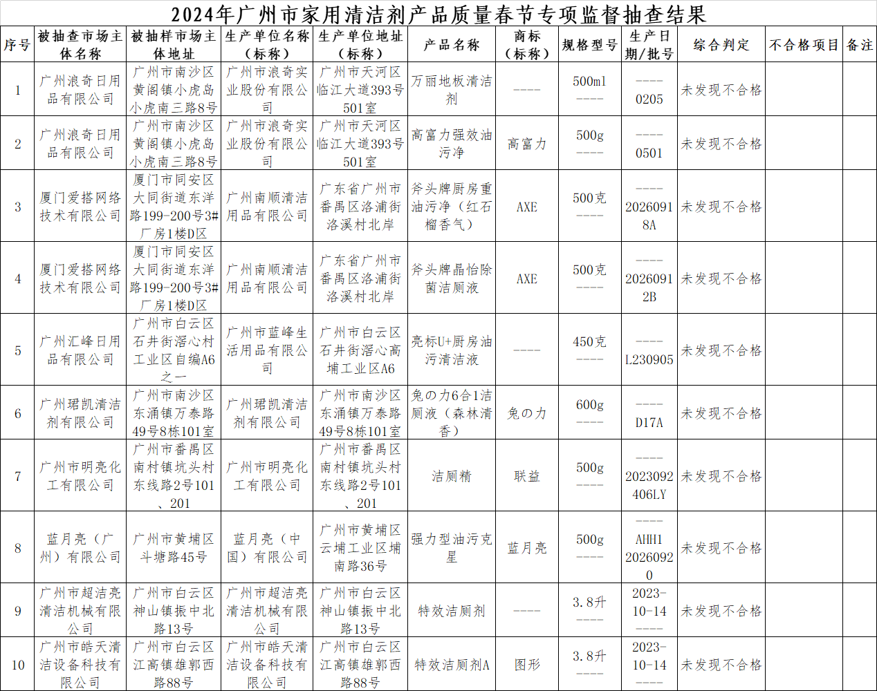 近日,广州市市场监督管理局对本市范围内家用清洁剂产品进行了专项监督抽查,共抽查了10批次产品,经检验未发现不合格。